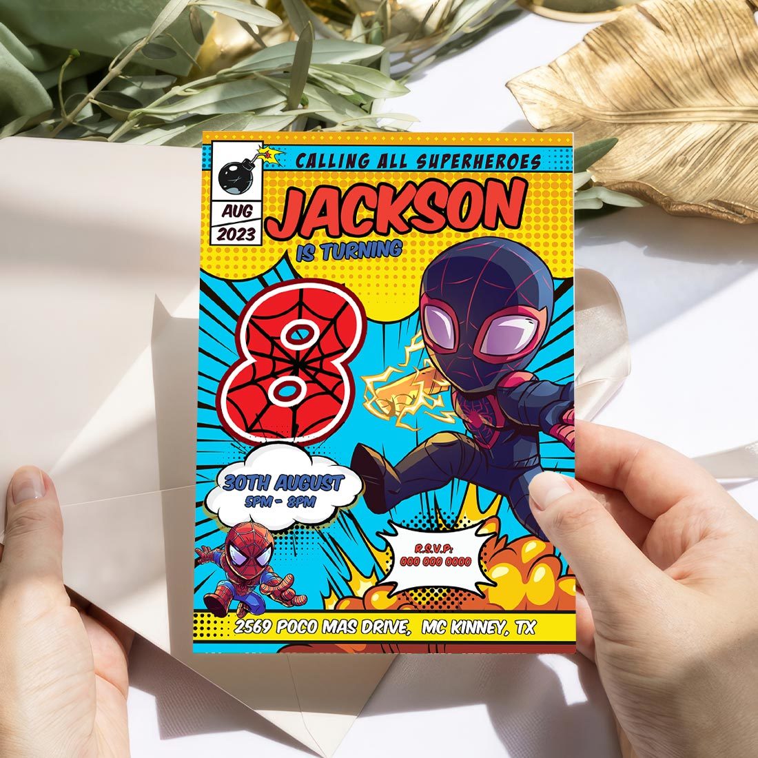 Miles Morales 8th Birthday Invitation Comic Style Canva Editable Instant Download