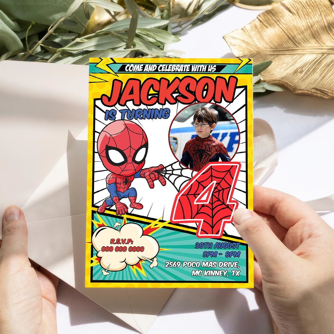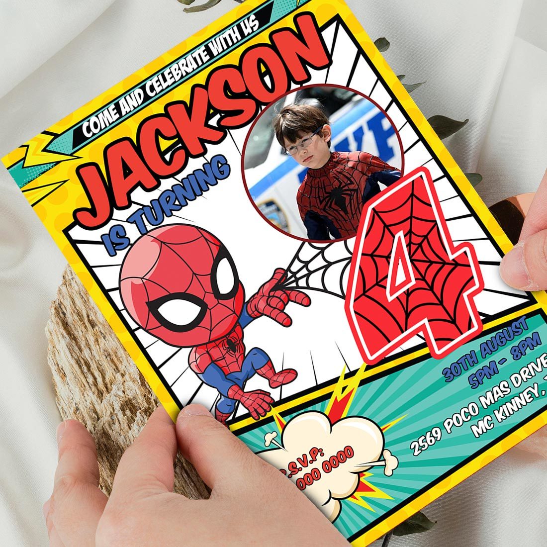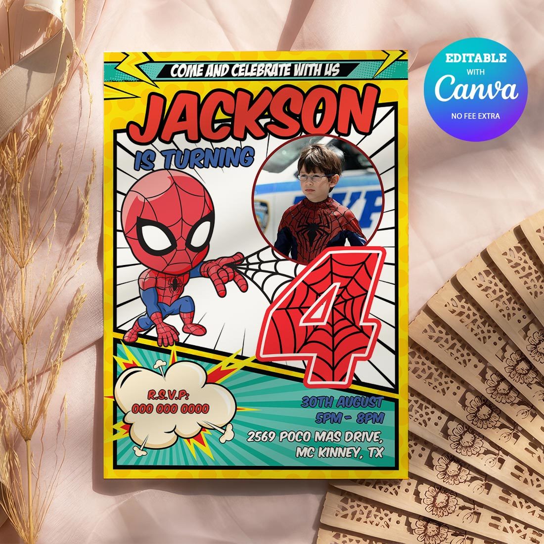 Spider Man Comic 4th Birthday Invitation, Spider Man Four Birthday Invitation Canva Editable Instant Download
