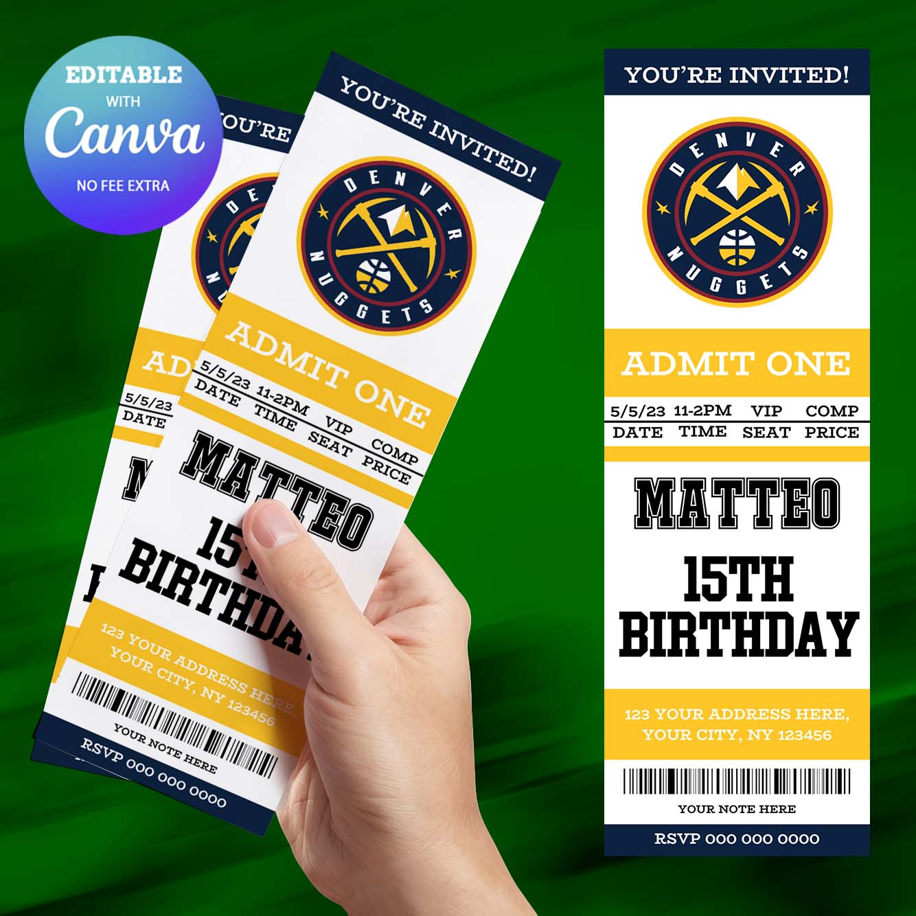 Denver Nuggets Birthday Invitation, Basketball Ticket Birthday Invitation Canva Editable
