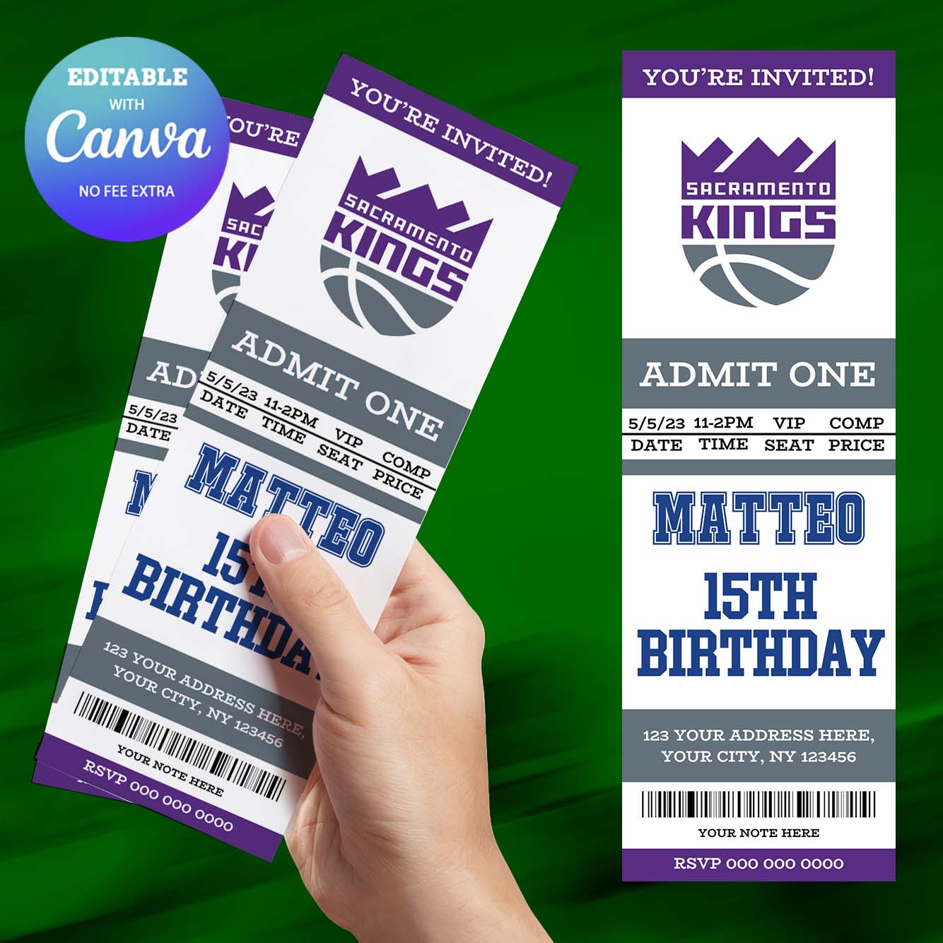Sacramento Kings Birthday Invitation, Basketball Ticket Birthday Invitation Canva Editable