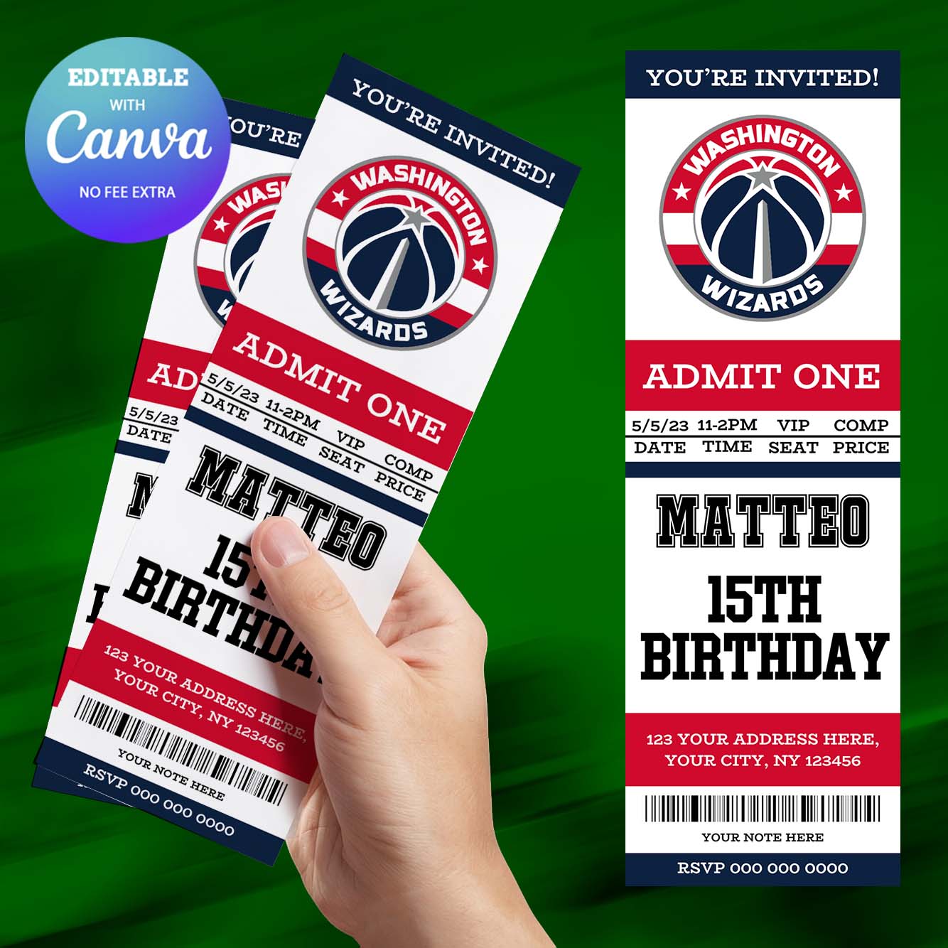 Washington Wizards Birthday Invitation, Basketball Ticket Birthday Invitation Canva Editable